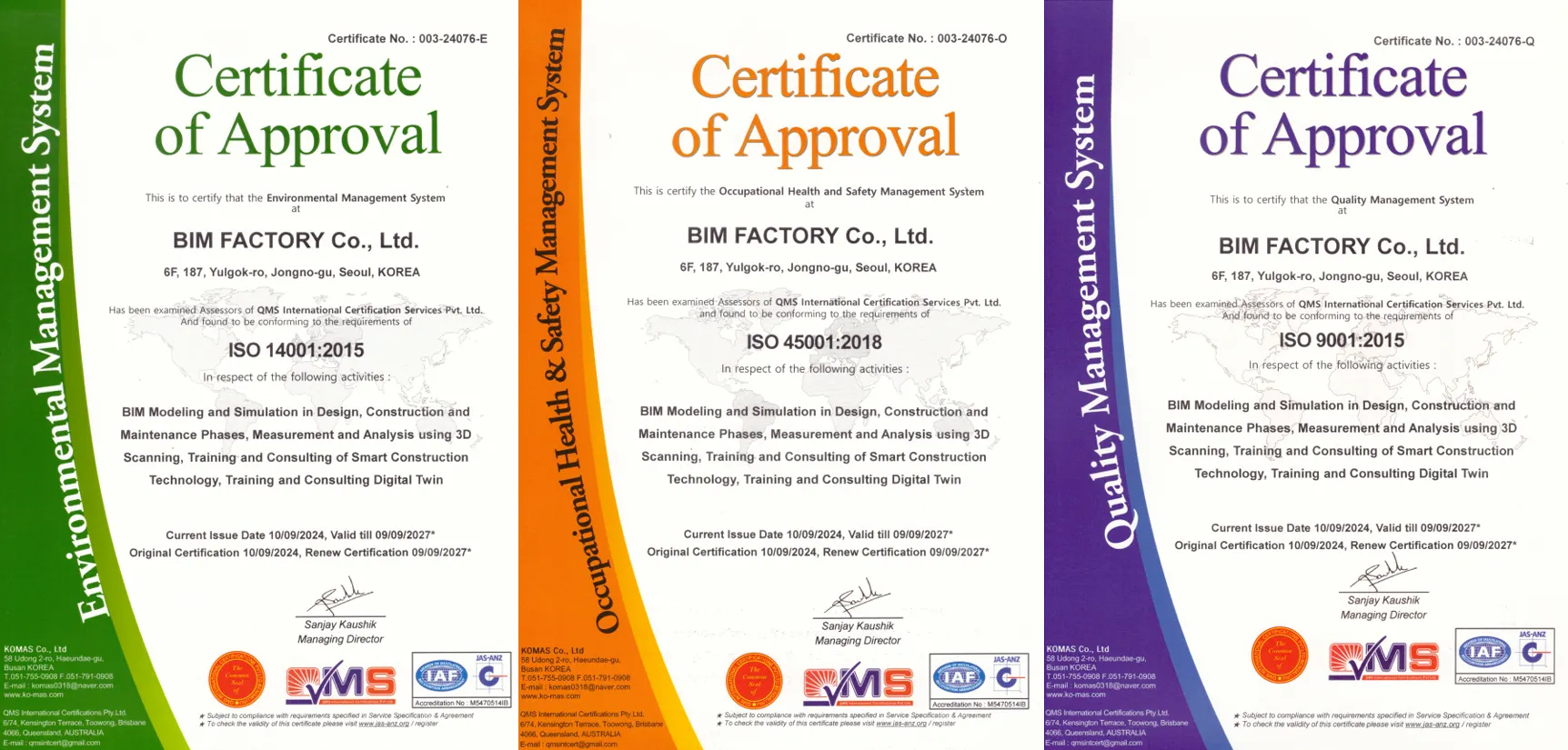 비아이엠팩토리는 지난 9월 10일 ISO 9001:2015(품질경영시스템), ISO 14001:2015(환경경영시스템), ISO 45001:2018(안전보건경영시스템) 인증을 취득했다. 인증 범위는 설계, 시공, 유지관리단계 BIM모델링 및 시뮬레이션, 3D스캐닝을 활용한 측정 및 분석, 스마트 건설기술 교육 및 컨설팅, 디지털트윈 교육 및 컨설팅 등 회사의 사업 영역을 포함한다.