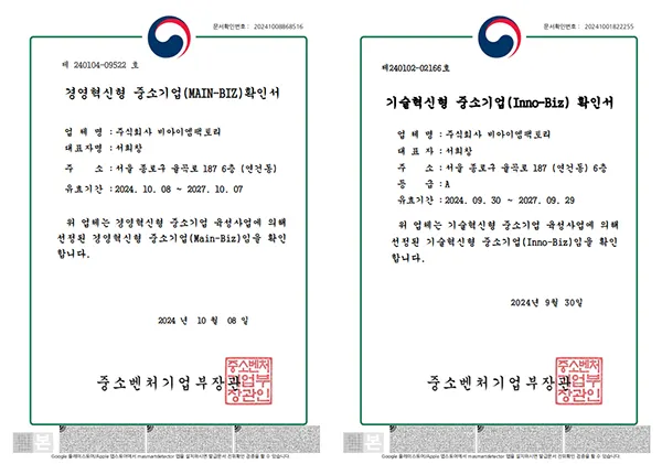 (주)비아이엠팩토리, 메인비즈·이노비즈 동시 인증 획득