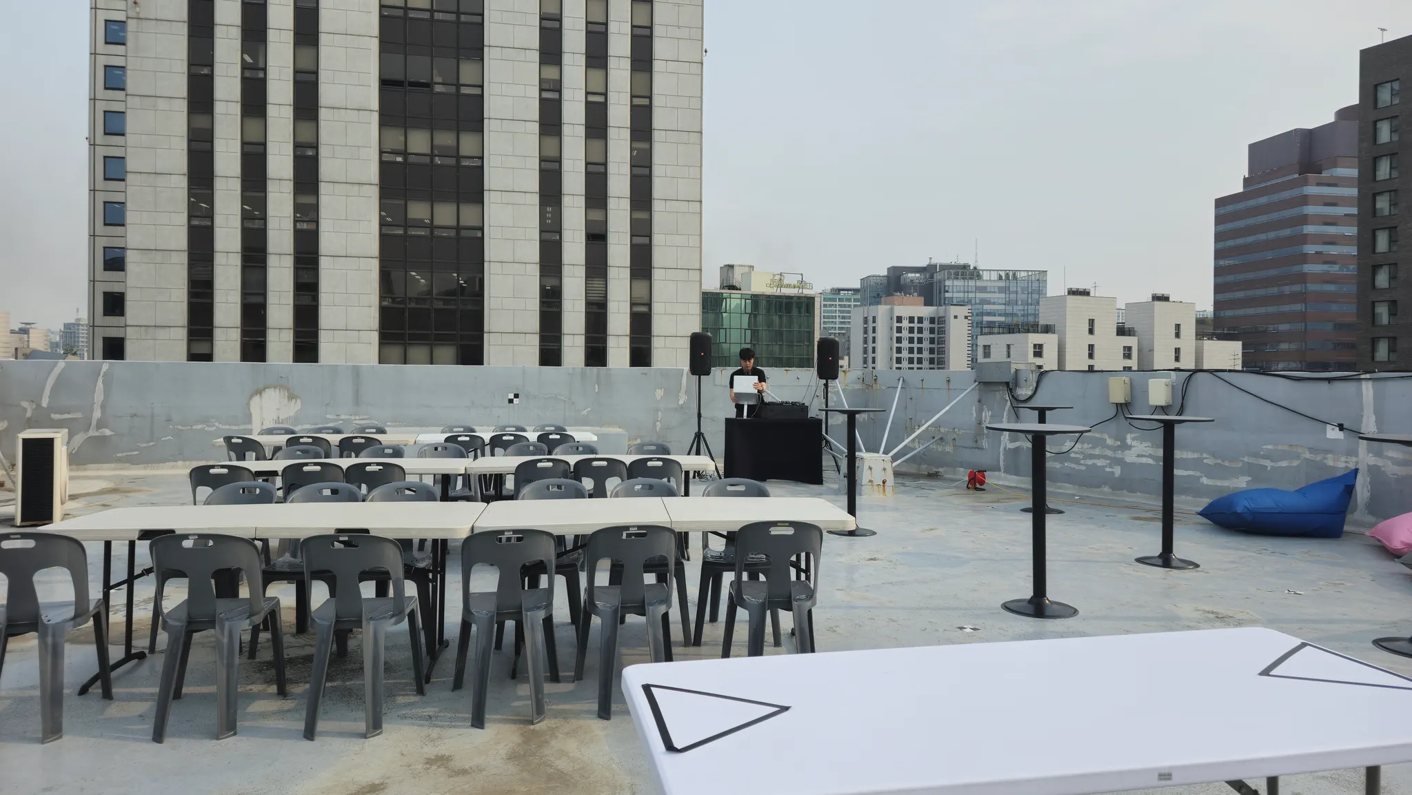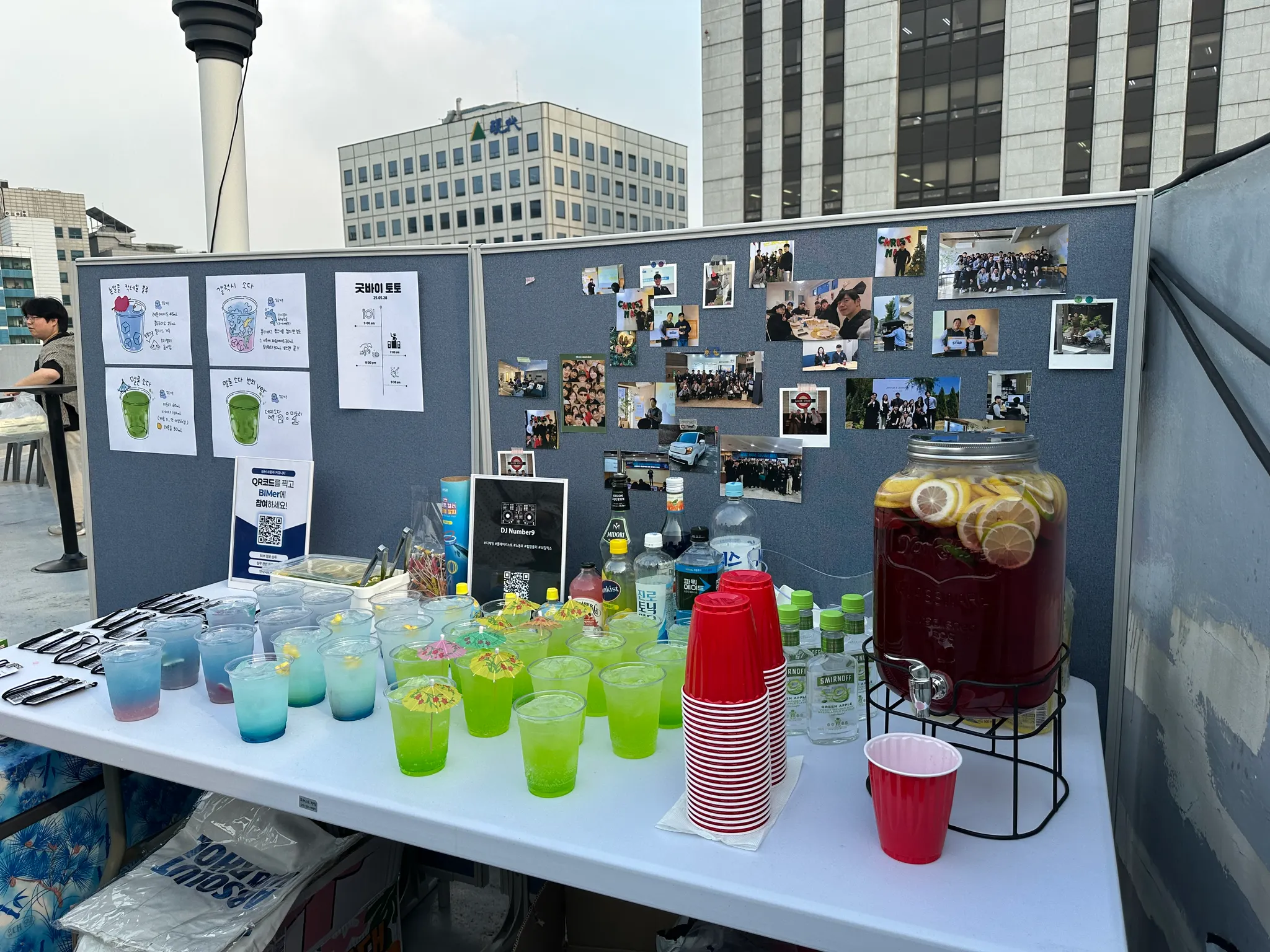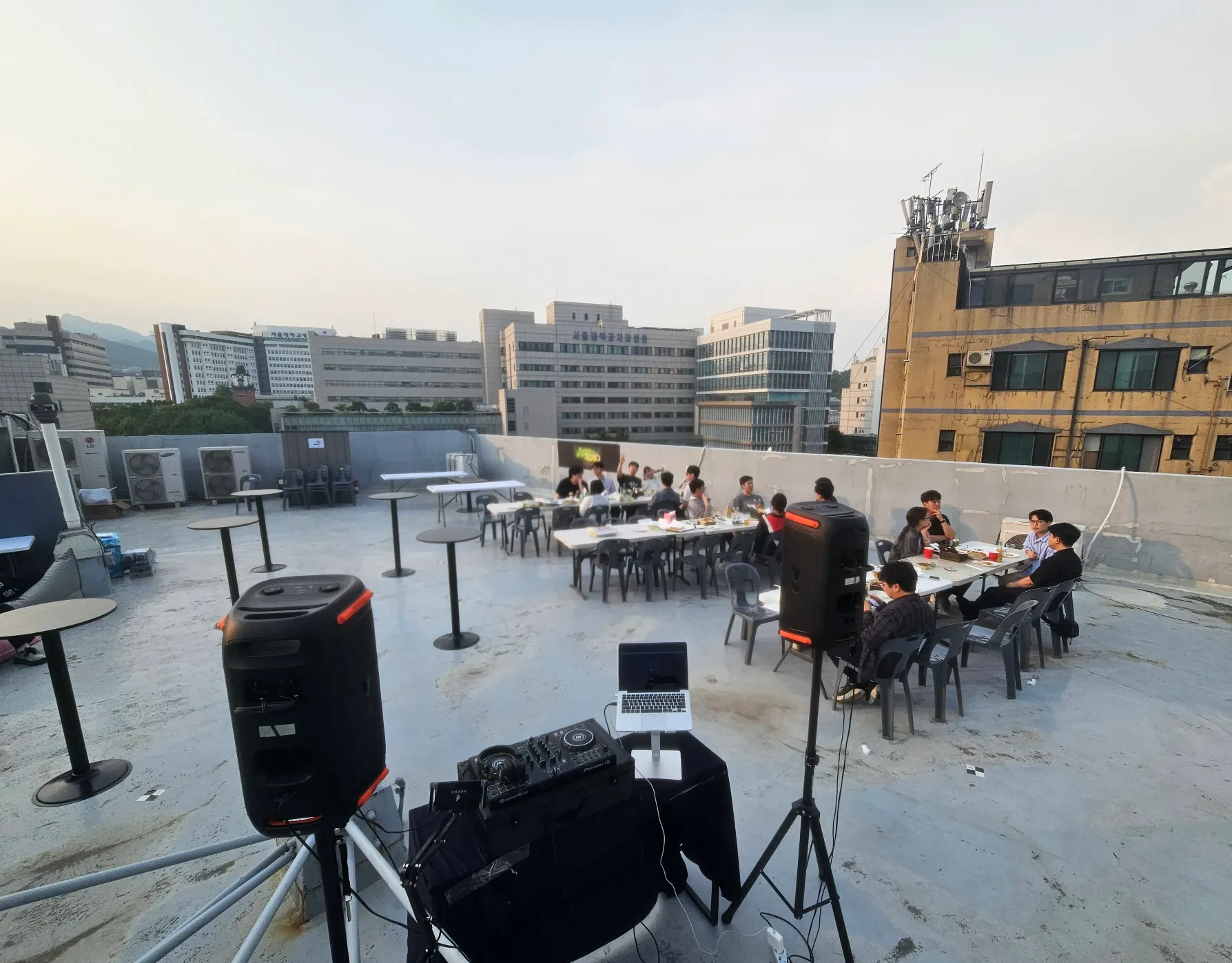 토토빌딩 옥상은 완전히 다른 세상으로 변해있었어요! 평소엔 잘 올라오지 않는 곳이었는데, 사무실이었다고는 전혀 생각이 들지 않을 만큼 멋진 파티 공간이었답니다. 디제잉 파티와 어울리는 테이블 세팅과 조명, 그리고 곳곳에 배치된 여러가지 스테이션까지… 정말 파티 분위기가 물씬 났어요.