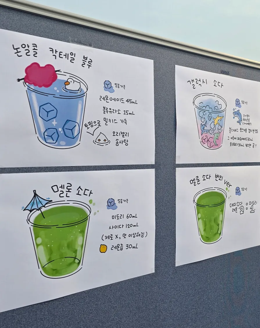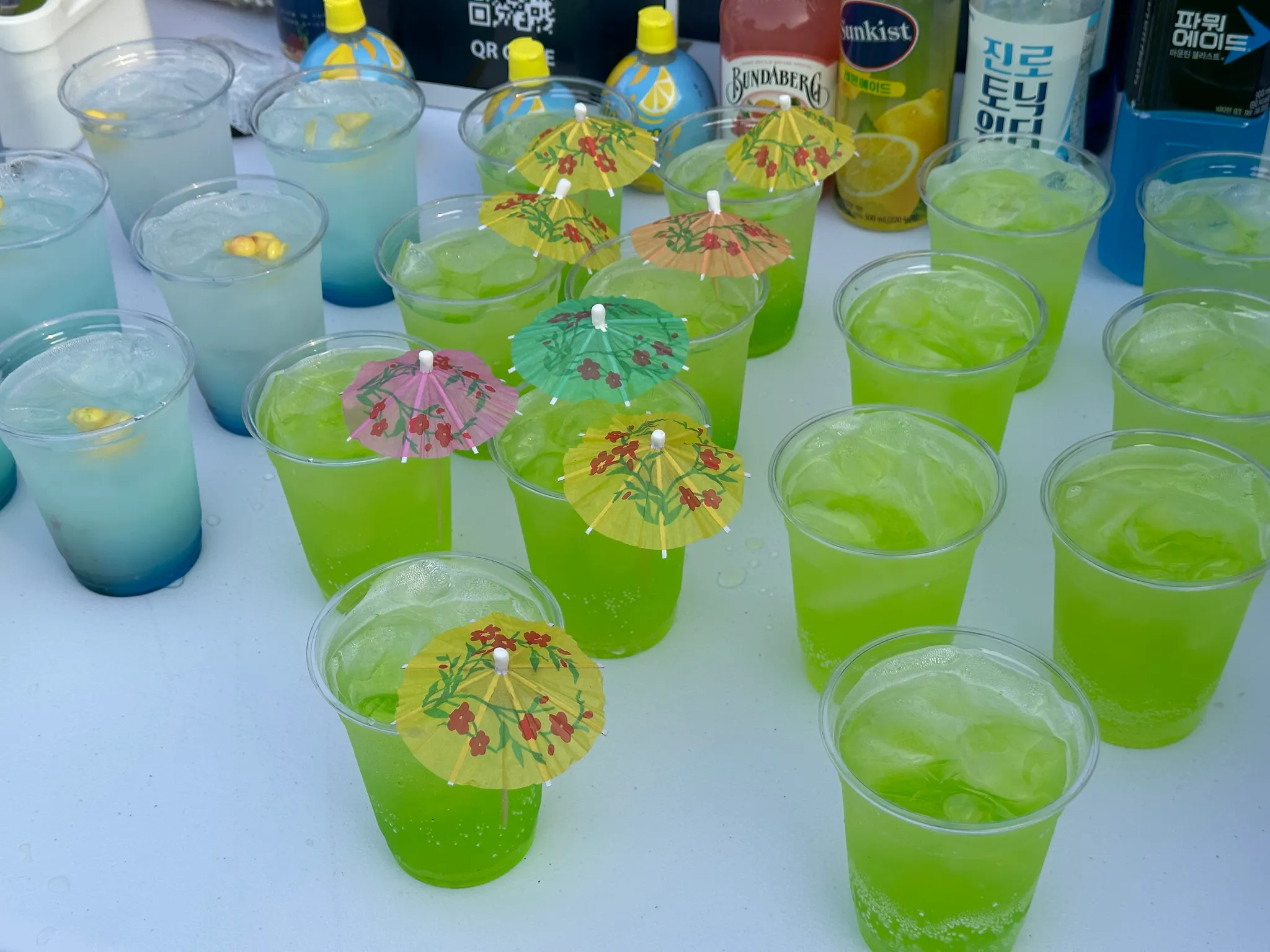 색색의 예쁜 웰컴드링크로 시작된 특별한 순간이었는데요, 첫 잔을 들며 그제서야 "이 공간도 이제 마지막이네"라는 생각이 들기도 하고, 시원하고 달달한 칵테일 효과인지 자연스럽게 파티에 녹아드는 기분이었어요. 칵테일 데코도 정말 예뻐서 사진 찍기 바빴답니다! 웰컴드링크 하나하나에도 정성이 가득 담겨있다는 게 느껴진 첫 인상이었어요!
