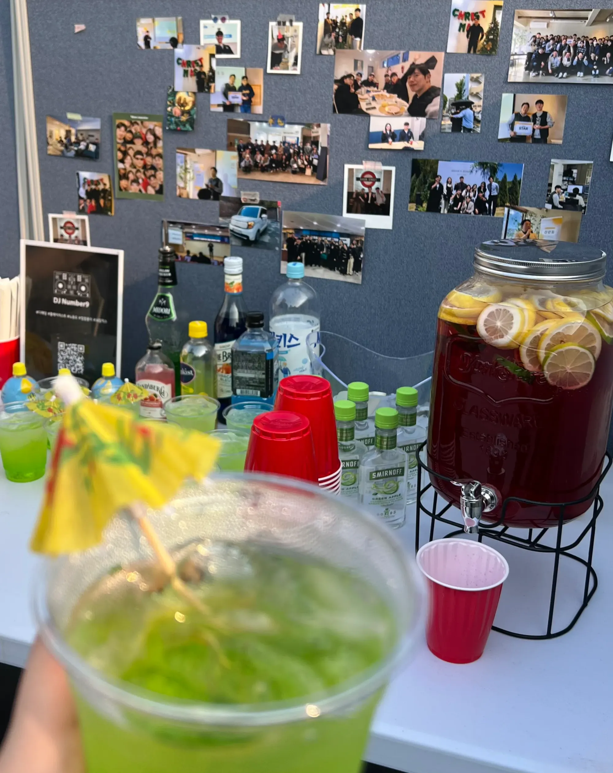 굿바이 토토는 팀팩토리의 공간이었던 토토빌딩 옥상에서 진행됐어요. 파티 장소의 문을 열면 웰컴 드링크와 함께 그간 함께했던 이야기들을 담고 있는 사진들이 맞이해주는데요. 저는 팀팩토리만이 가질 수 있는 이야기가 가득한 이 공간이 너무 마음에 들었어요.