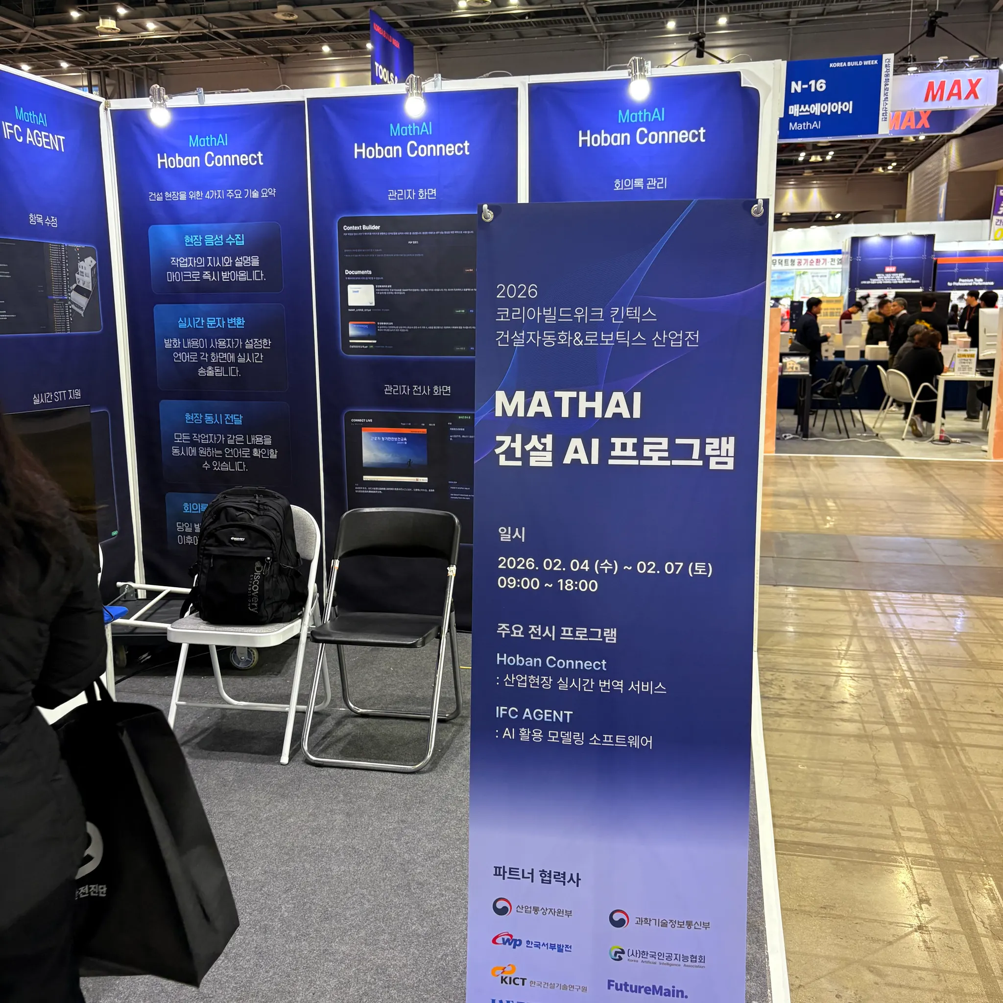 특히 눈길을 끈 건 MathAI와 TWIN-X 부스였는데요. MathAI에서는 현장의 음성을 실시간으로 텍스트로 변환해 회의록을 자동 작성하는 AI 솔루션을 시연했습니다. 특이점은 다국어 번역이 가능하고 각자 원하는 언어로 해당 번역을 확인할 수 있는 connection 기능이 있어 현장의 소통에 주요한 역할을 할 걸로 보였습니다. AI 비서가 현장 소통을 실시간으로 해결해주는 셈이니, 현장 관리자들에게는 실질적인 도움이 될 것 같았습니다.