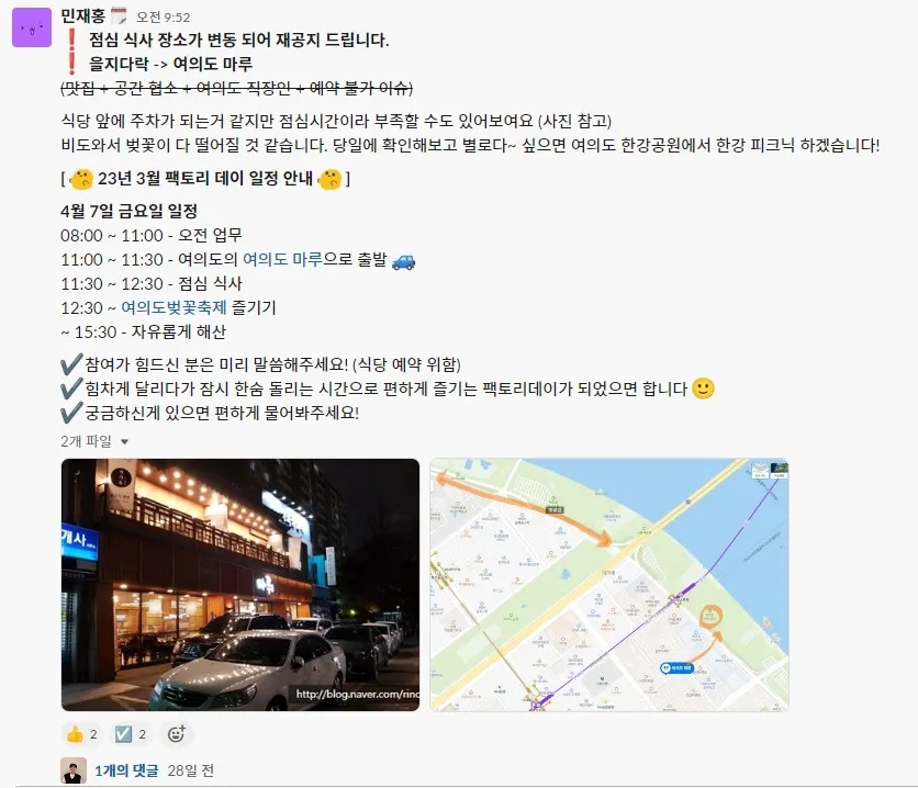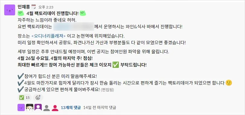 여느때와 같이 슬랙 공지를 통해 팀원분들의 일정에 최대한 무리가 없도록 합니다. 팀원분들의 시간은 소중하니깐요. 그래도 일정이 안맞아 참여를 못하는 팀원분들이 있어서 아쉽습니다. (이번 팩토리데이는 저도 참여를 못했네요.