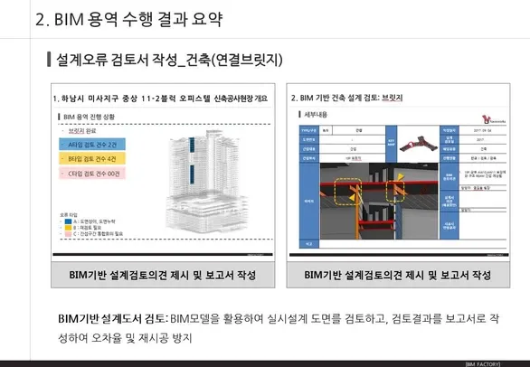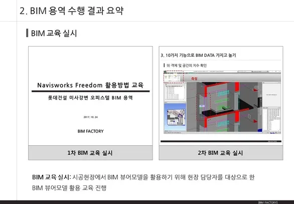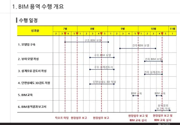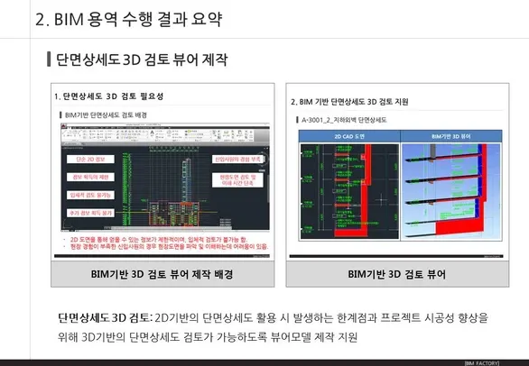용역내용은 구조 건축 시공성 검토,BIM 기반 단면상세도 3D 검토 지원, Navisworks 제공및교육, 커튼월 외피 검토, 콘크리트물량, A360방향 제시 등 이였습니다