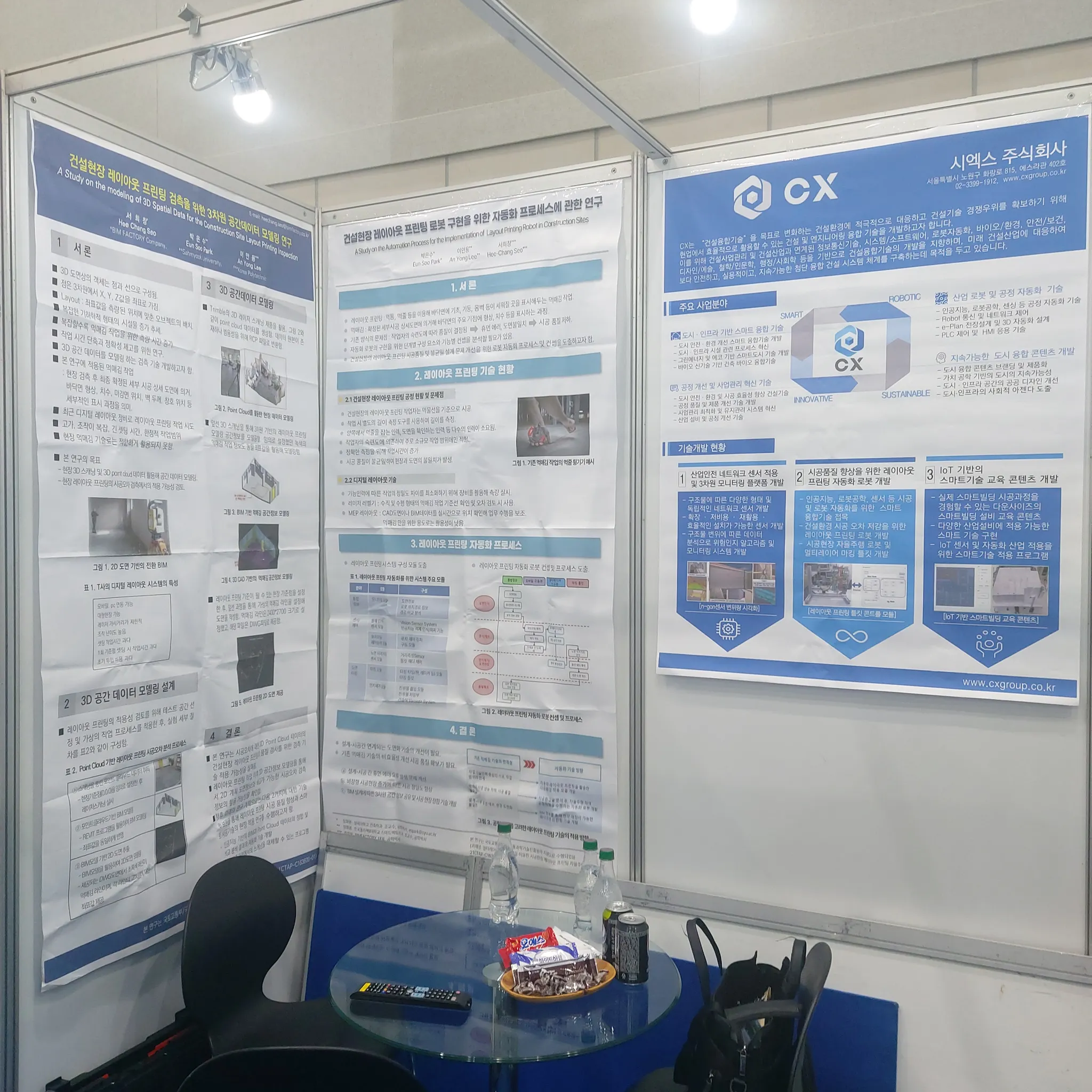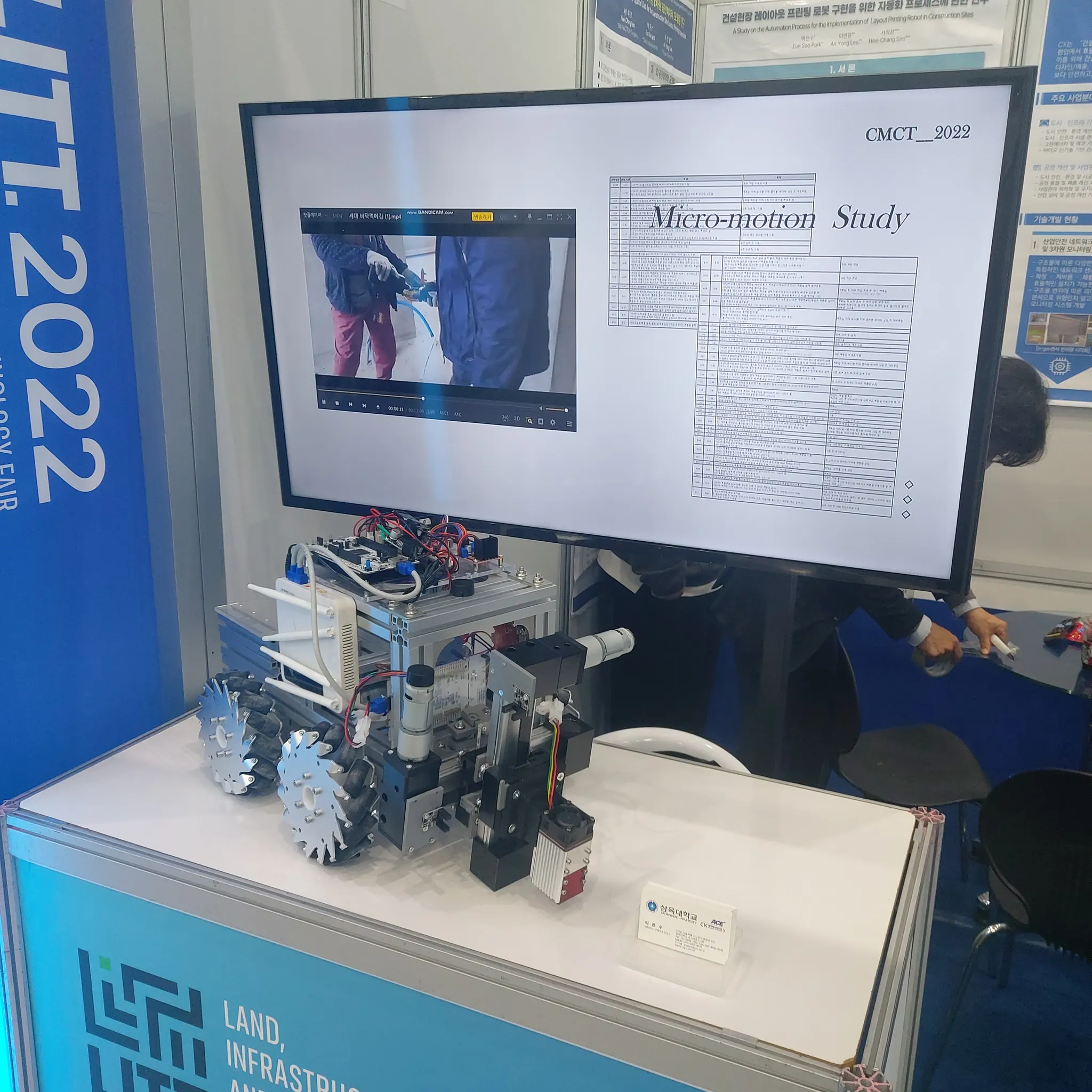 부스 좌측에 박은수 교수님, 이안용 교수님, 서희창 대표님 세 분이서 연구하신 건설현장 레이아웃 프린팅 로봇에 관한 로봇과 패널을 전시하였어요.