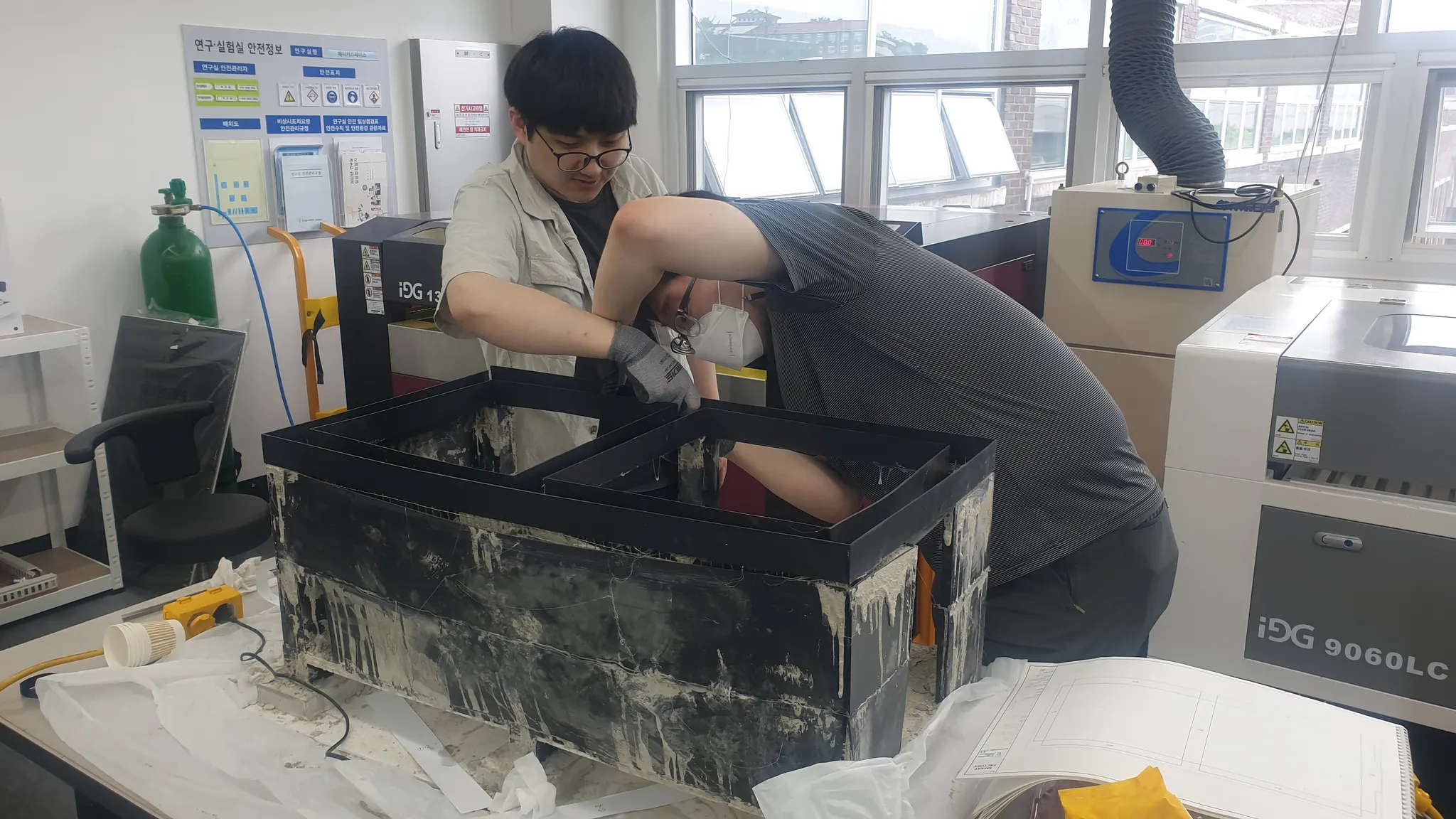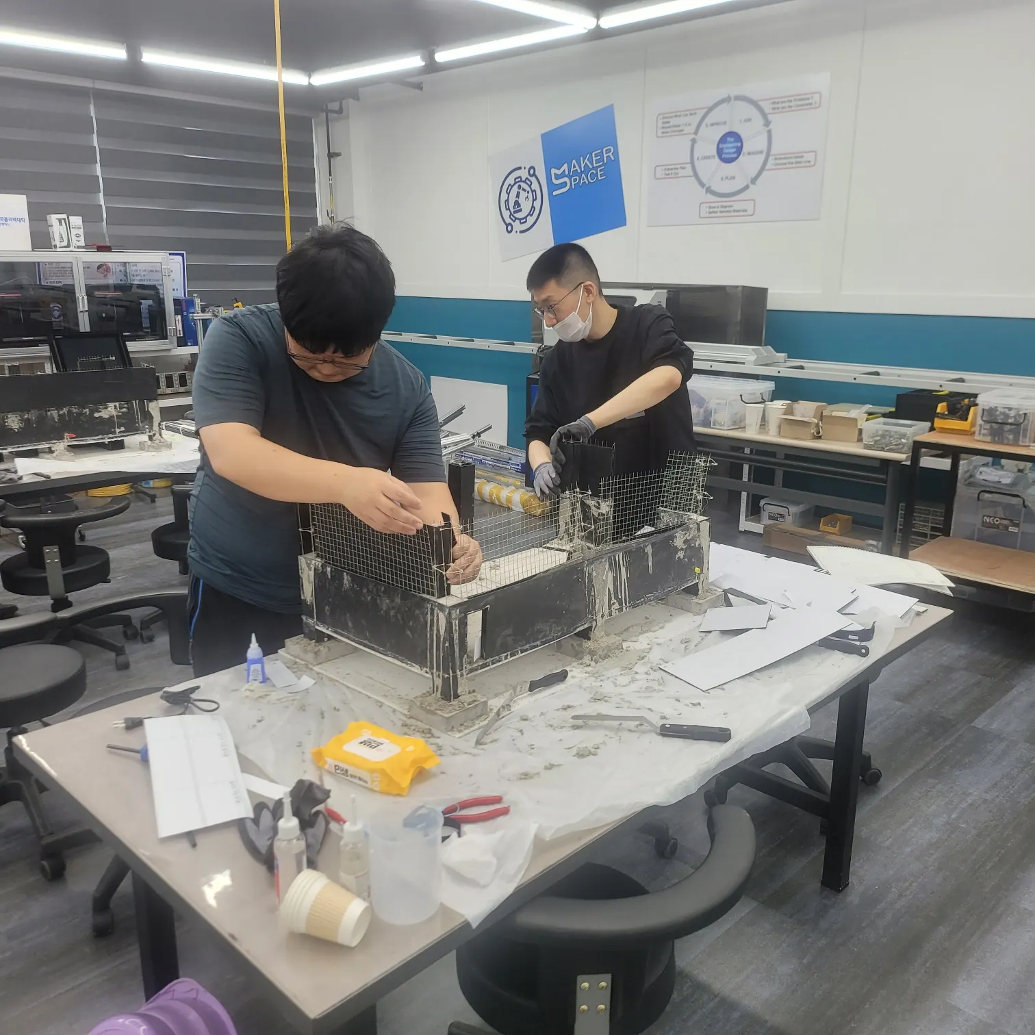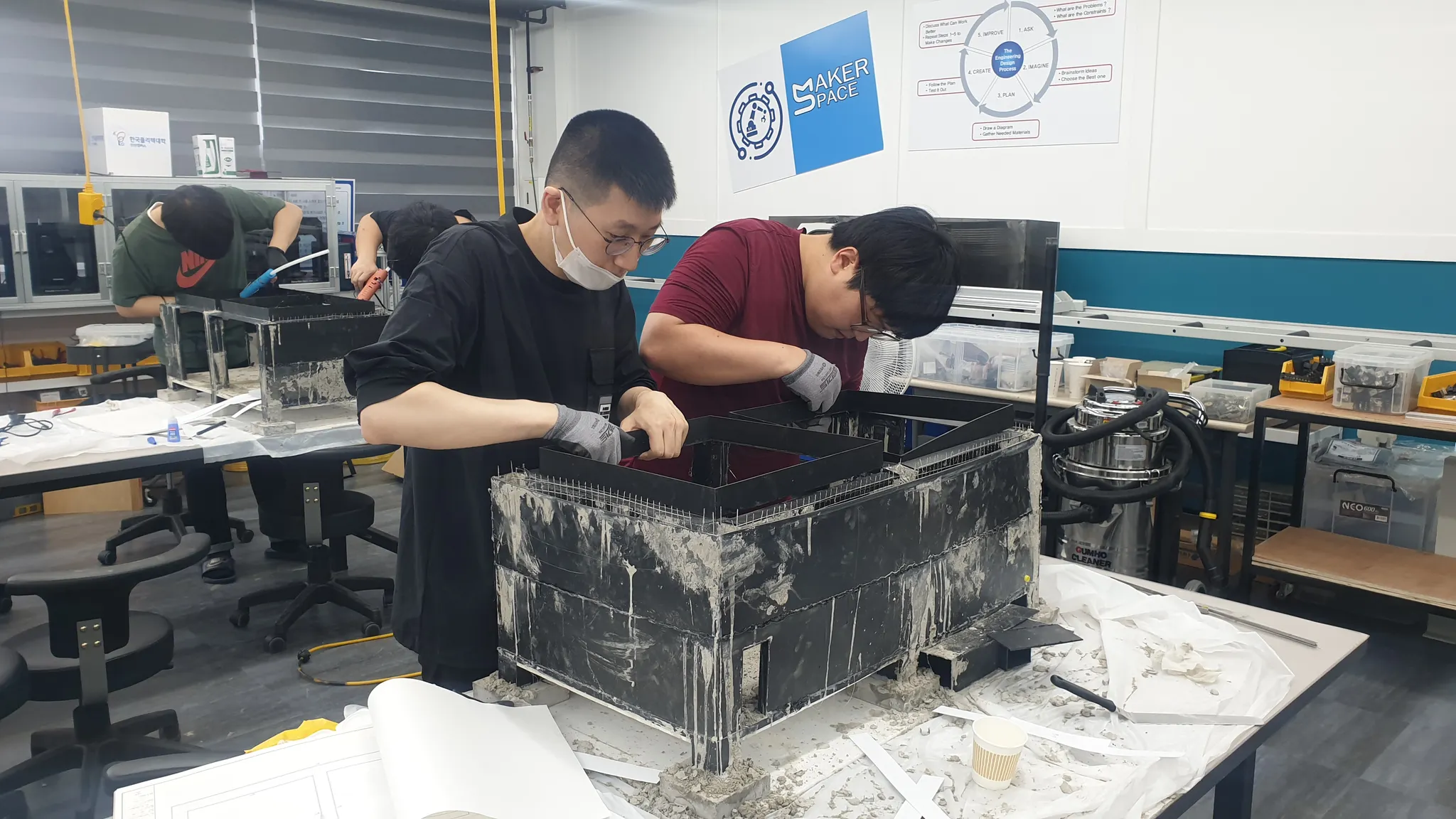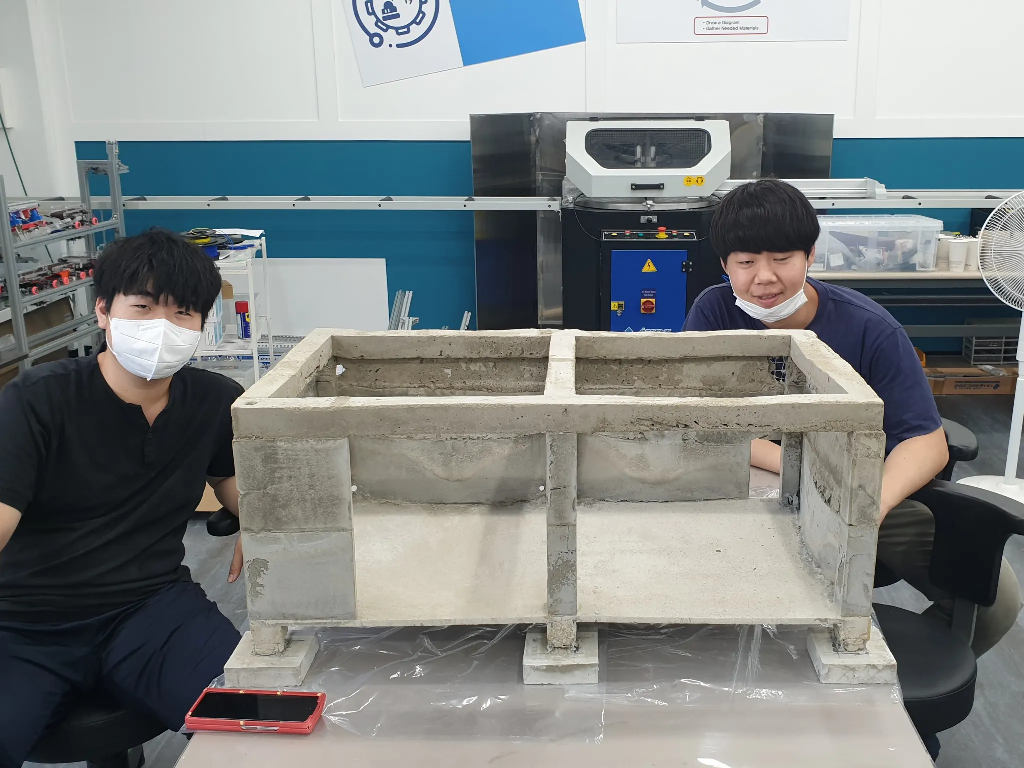 보기보다 벽체와 기둥에 들어가는 콘크리트 양이 어마어마하다보니 배부름 현상을 최소화하기 위해 갖은 수를 썼어요. 이부분도 체험 하는 학생들이 고민하지 않게끔 제작 단계에서부터 고려해야할 사항이에요.
