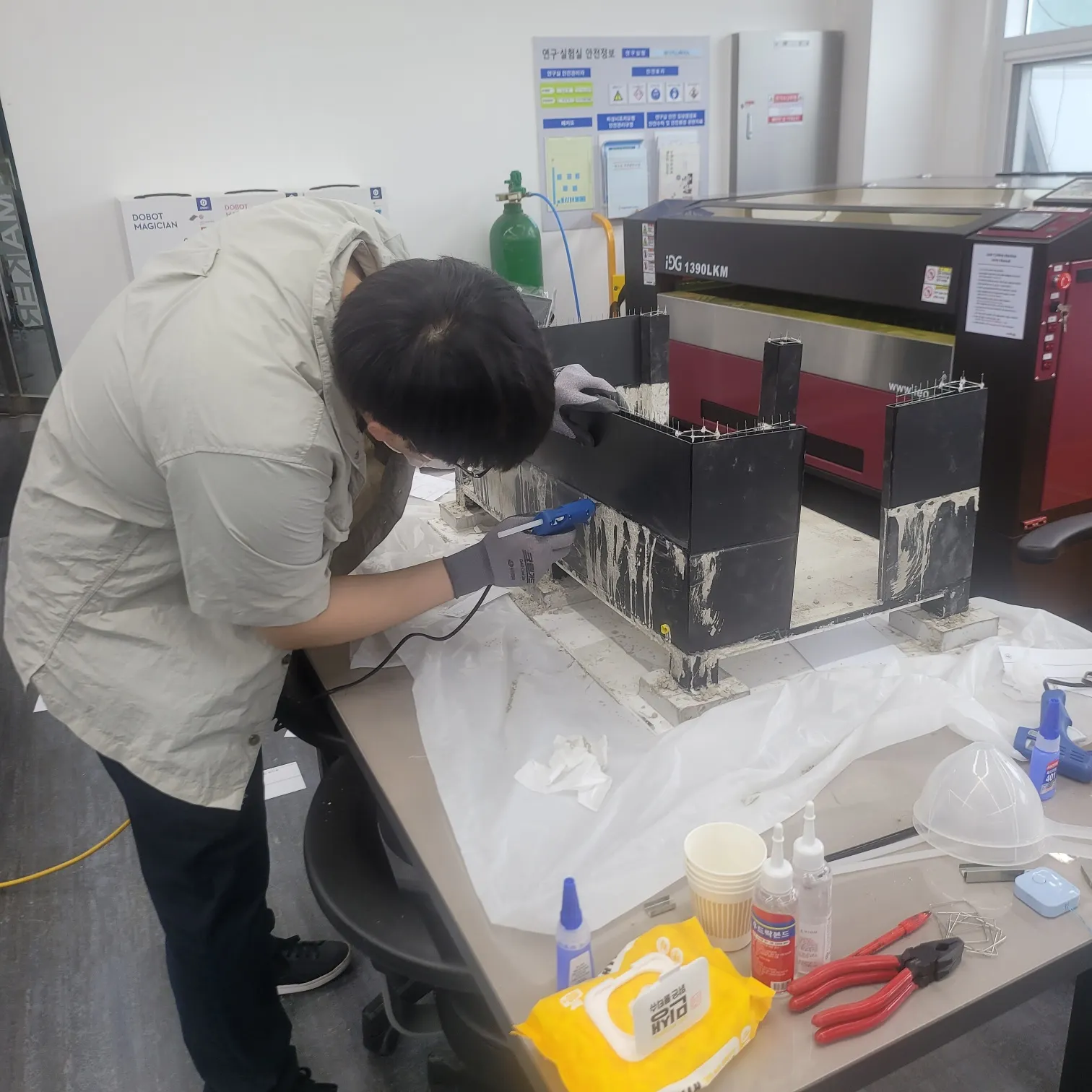 배부름 현상으로 거푸집 사이에 빈 공간 등을 글루건, 포맥스, 종이 등으로 막아가면서까지 끝내 콘크리트 타설을 잘 마쳤답니다.(감동)