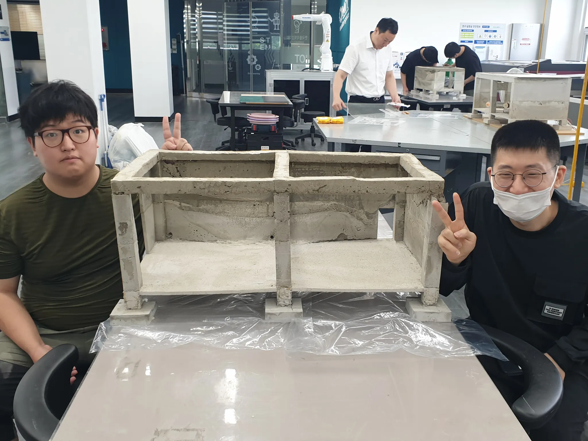 실습으로 잡힌 6일 중에 오늘이 가장 힘든 날이었을텐데 다들 잘 따라주었답니다. 콘크리트 타설로 인해 슬라브 윗면과 주변에 흩뿌려진 시멘트들은 추후 정리가 되니 괜찮답니다.